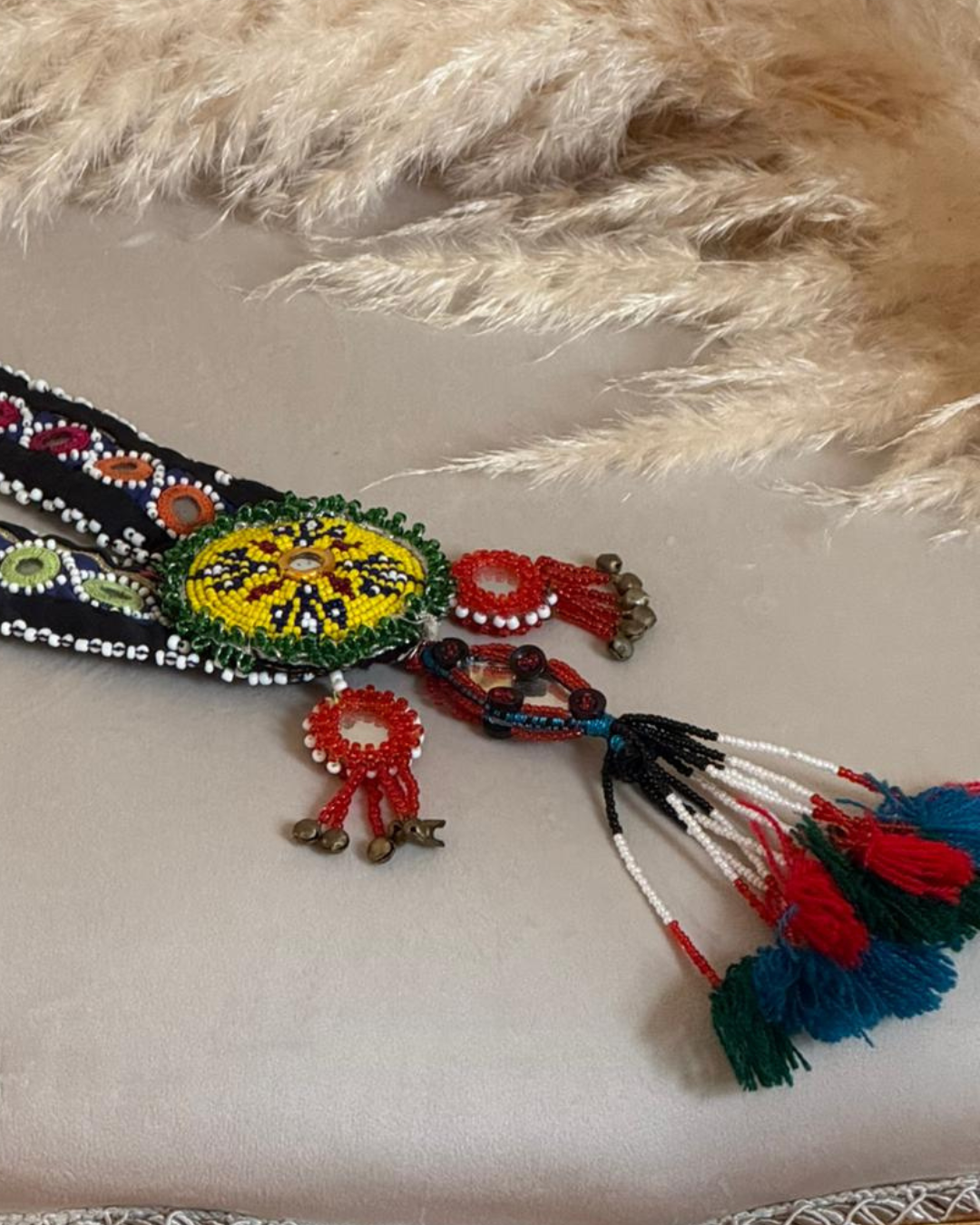 Collar artesanal inspirado en colores vibrantes. Hecho a mano con tela, espejos, pasamanería blanca, madera rosa, pompón, espejos, cascabeles, abalorios étnicos, cordón, hilo de costura. Diseñado para dar un toque boho a cualquier look. Longitud: 42 cm