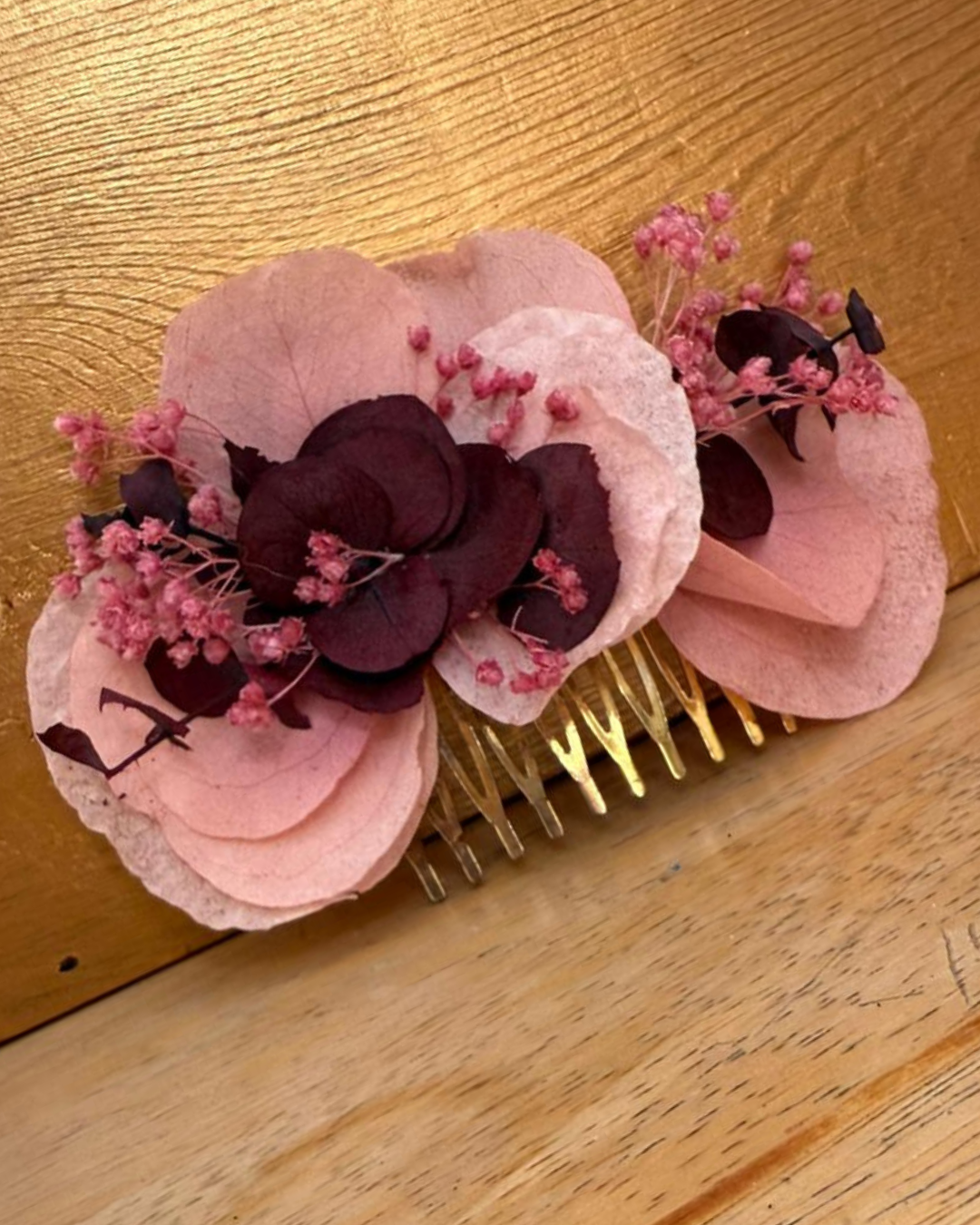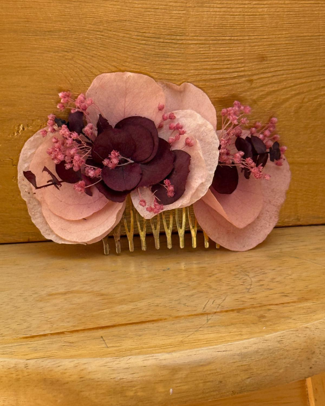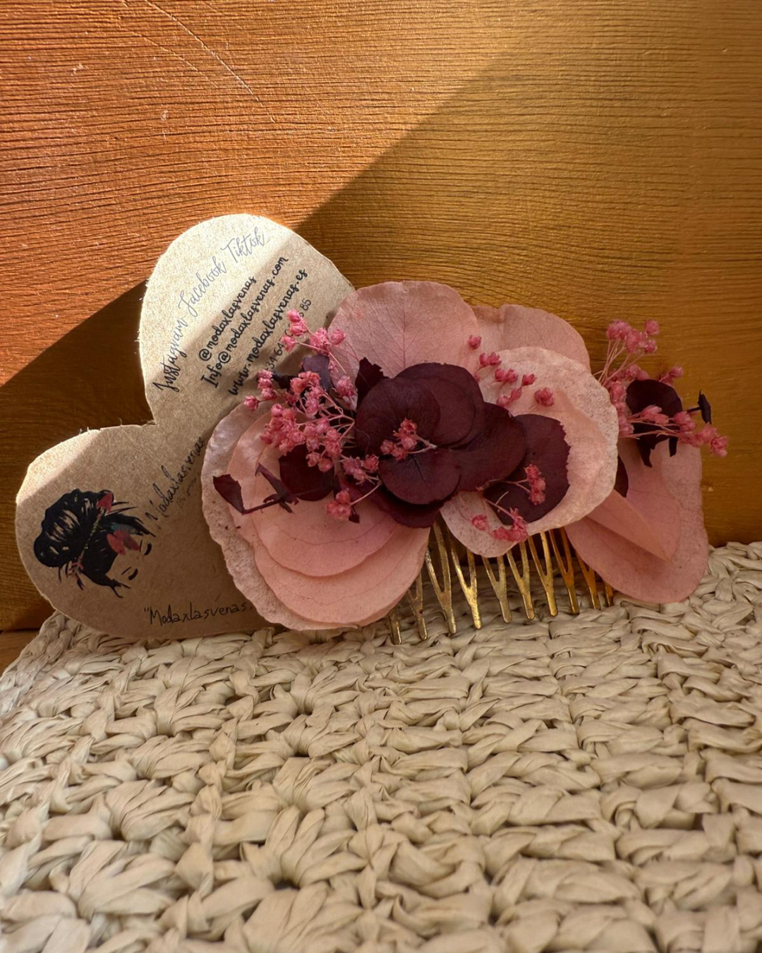 Hero es una peineta con flores preservadas en tonos rosados y beige, pensada para completar un look femenino y suave. Su estructura ligera permite colocarlo con comodidad en trenzas, recogidos o semirecogidos.