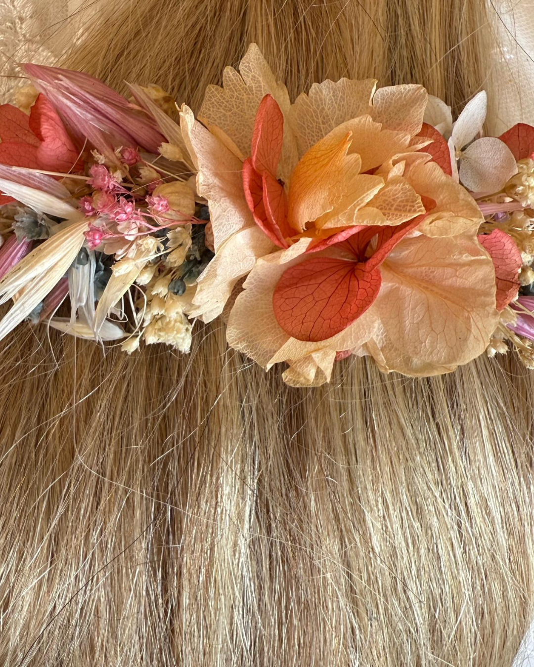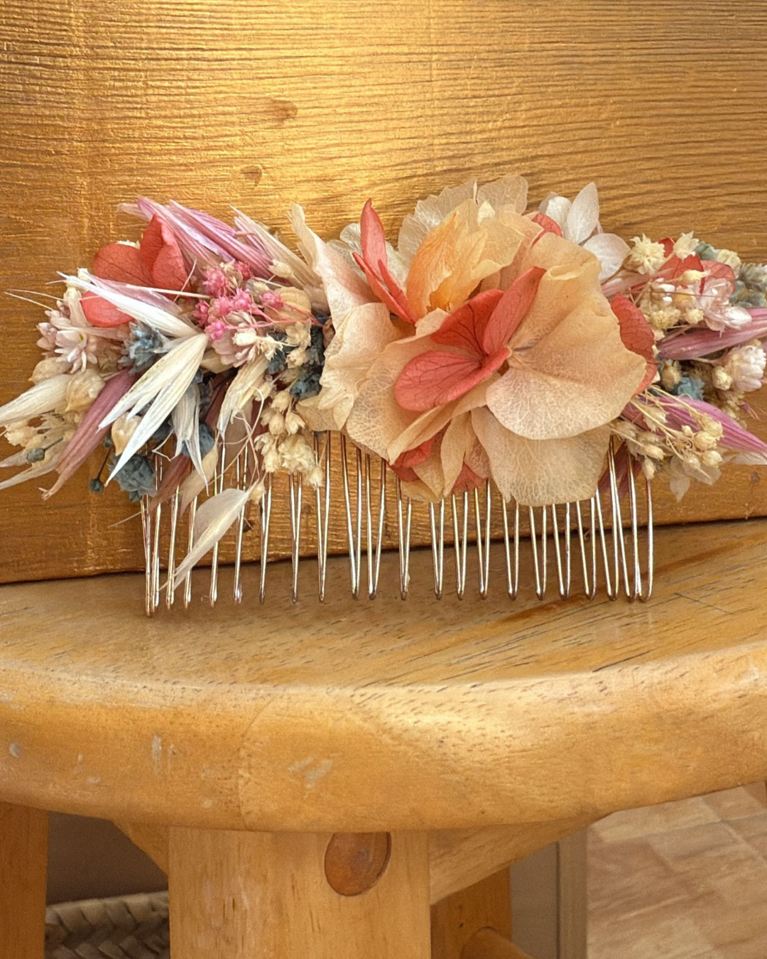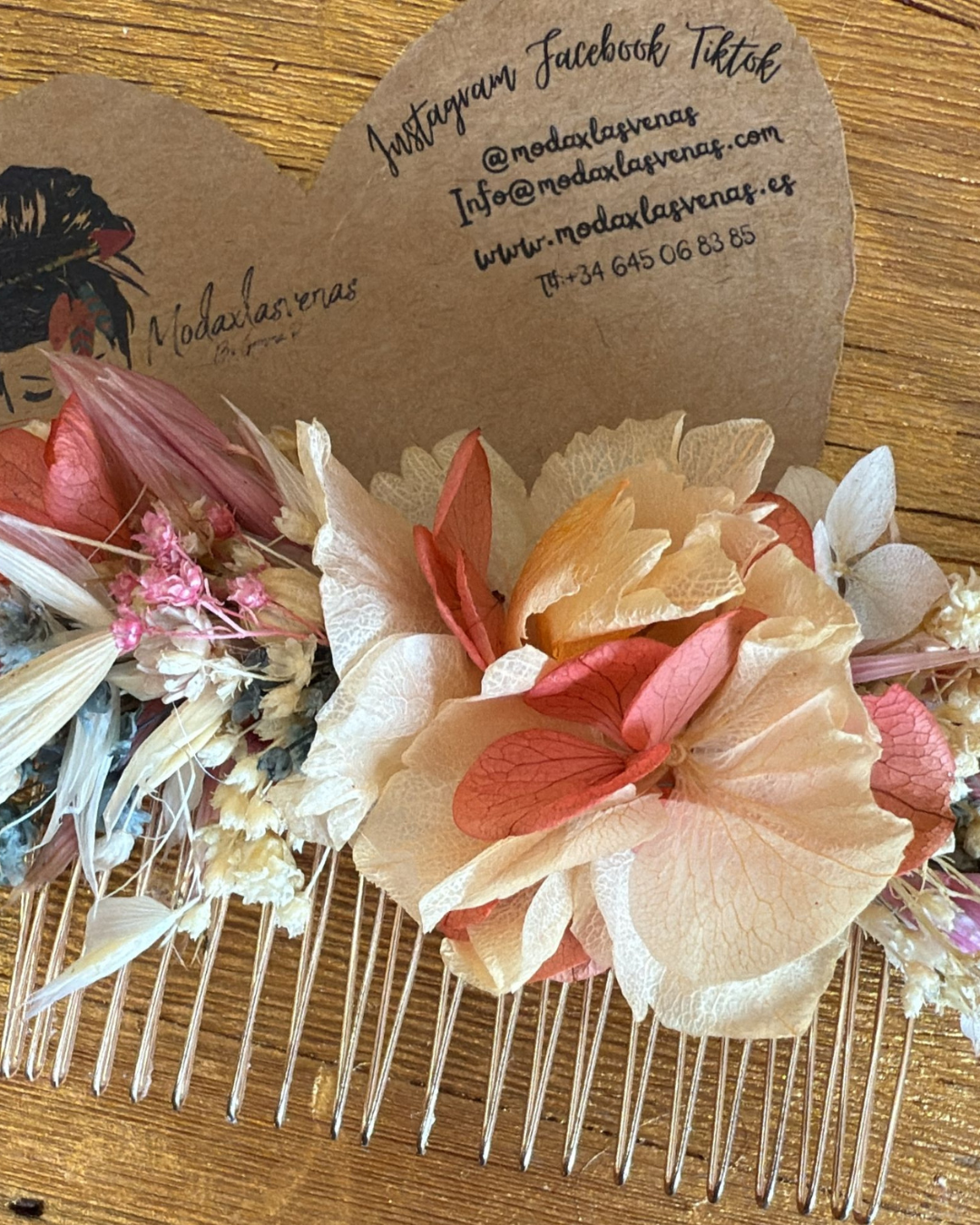 Peineta de 22 dientes con flores preservadas y hortensias en tonos suaves. Ideal para novias e invitadas.